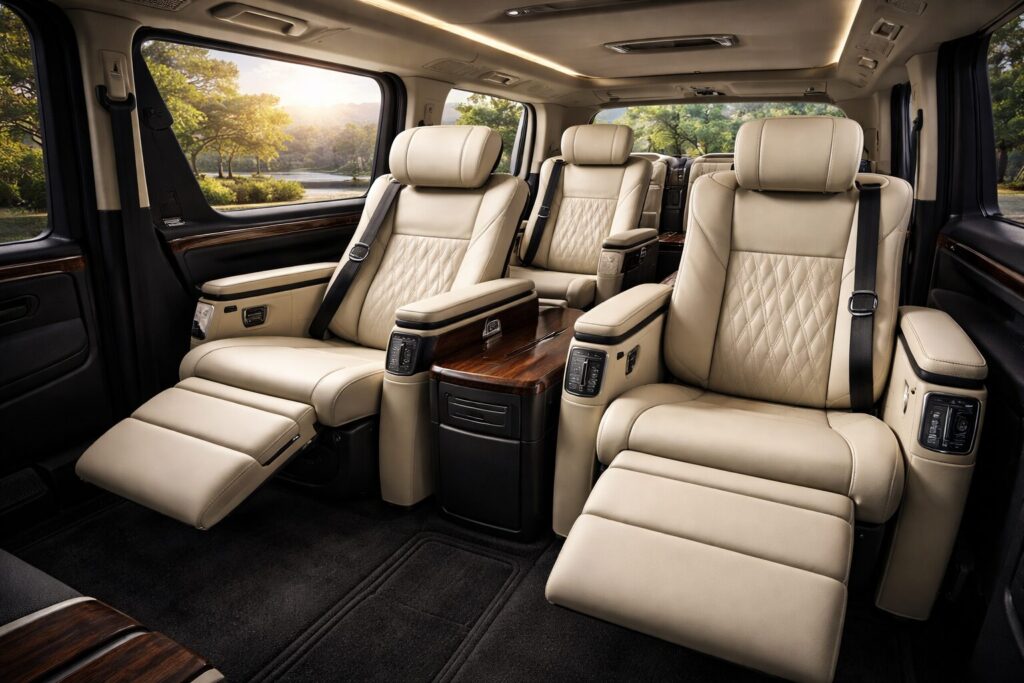 第一印象は「新幹線のグランクラスに近い」でした。電動でリクライニングして脚も伸ばせます。アルファードのエグゼクティブラウンジと同等のシートが、2・3列目の全席についています。