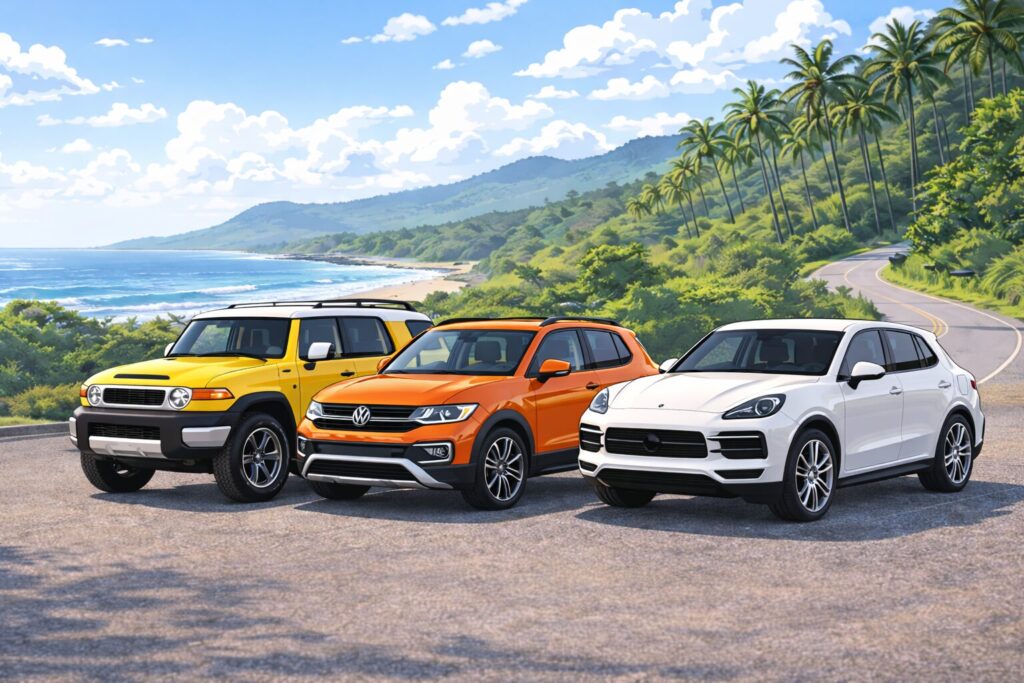 | 那覇空港でヒットした | FJクルーザー・カイエン・VW T-Cross | BMW 420iカブリオレ・Gクラス・ランクル250・ボクスターなど |