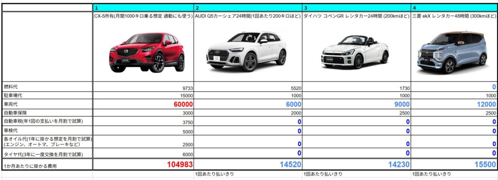 これ、毎週末、週替わりで1台ずつ借りても、CX5の保有より全然安いですからね(笑)