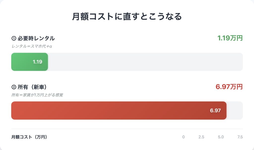 なんと、所有と好きな時、月一回程度遊ぶの差が年間約70万円です!